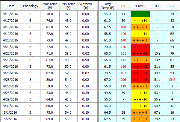 conditions for Apr 21, 22 and 23 and only wetting is lacking for Apr 25-27. In situations where all other requirements for infection have been
